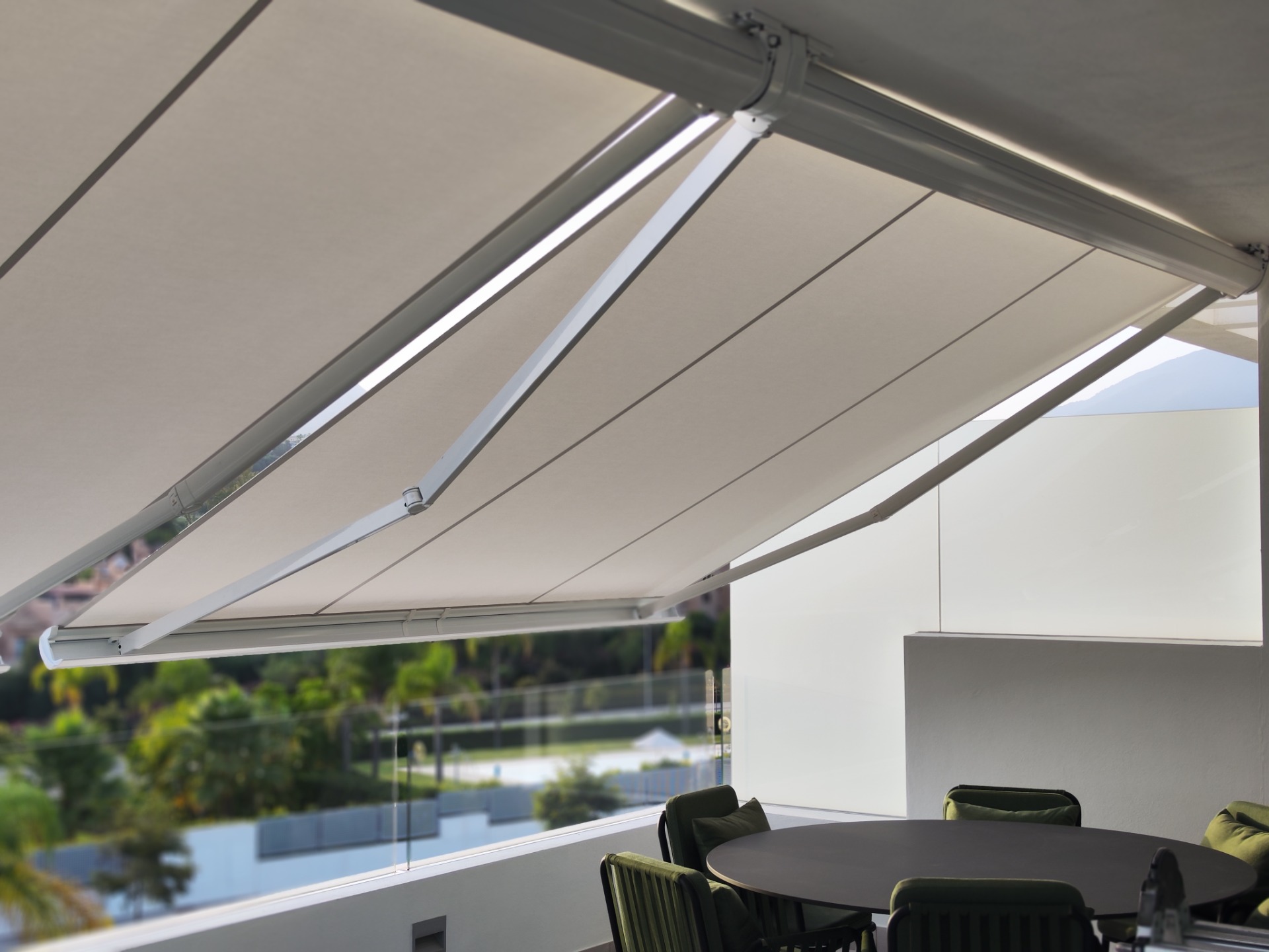 Toldos extensibles, helix. Es un toldo articulado, de soportes independientes lateralmente fijo ,donde comprende el soporte del brazo con regulación. Se instalan en muchos patios y locales en Cadiz.