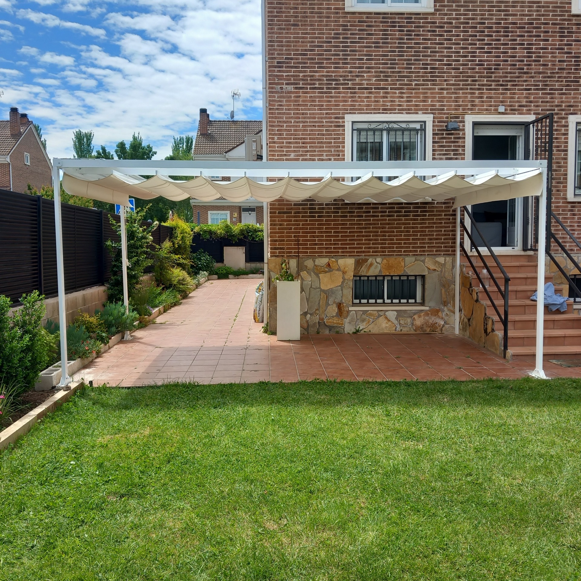 Toldos pérgolas porteria-porteria, 80 x 40. Es un toldo plano o pérgola, caracterizado por su lona en forma de ondas y cuatro postes. Se instala en jardines, patios en plan cenador.